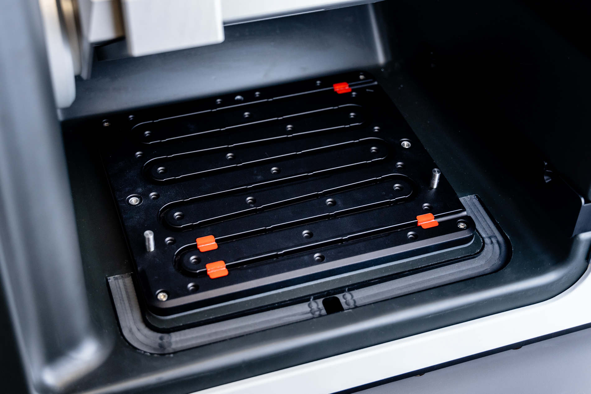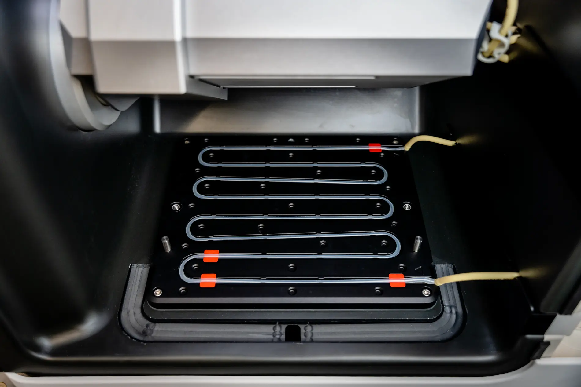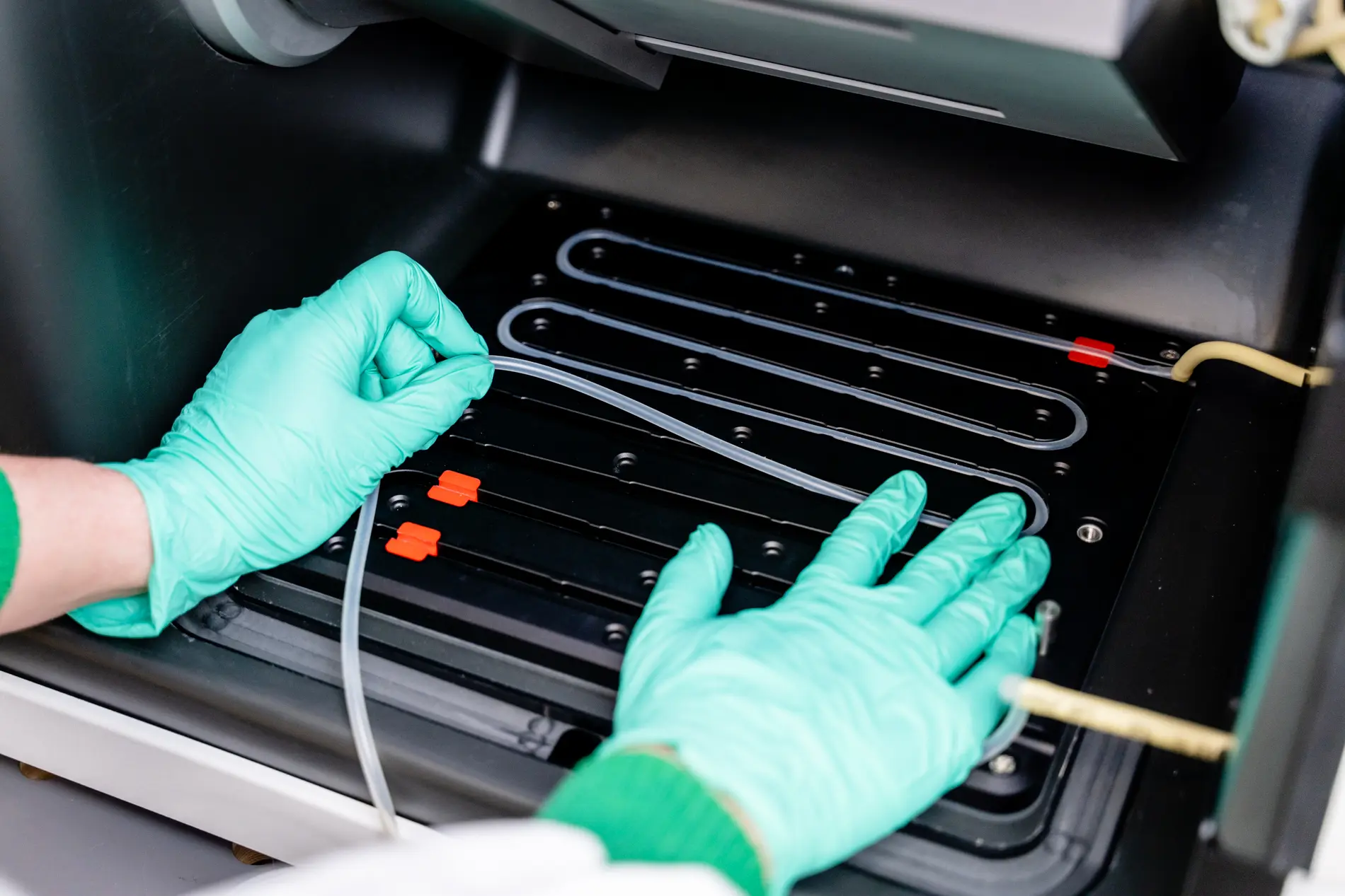 The semi-permeable part of the tubing of the culture bag can be easily placed in the meandering channel of the carboxygenator, after which the top plate is put on to keep the system closed and under the right pressure: